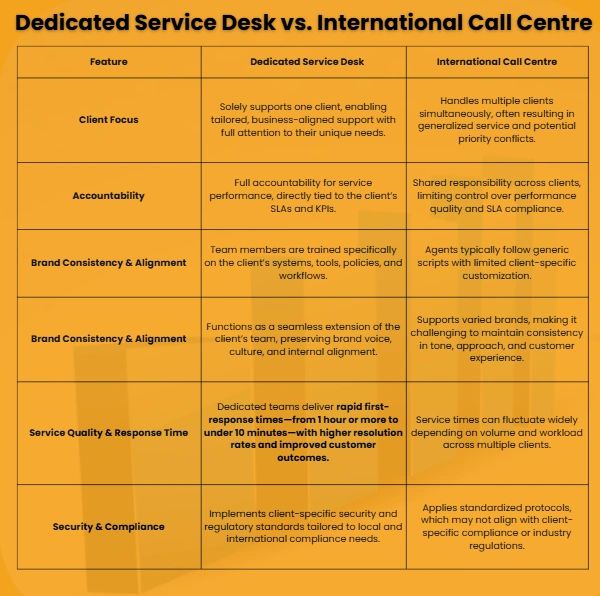 A Dedicated Service Desk serves as a eamless extension of the client’s organization, delivering tailored support, clear ownership, and consistently high service standards. By aligning directly with the client’s objectives and eliminating the distractions of multi-client environments typical of traditional call centres, it ensures every interaction adheres to the client’s specific requirements and service expectations.